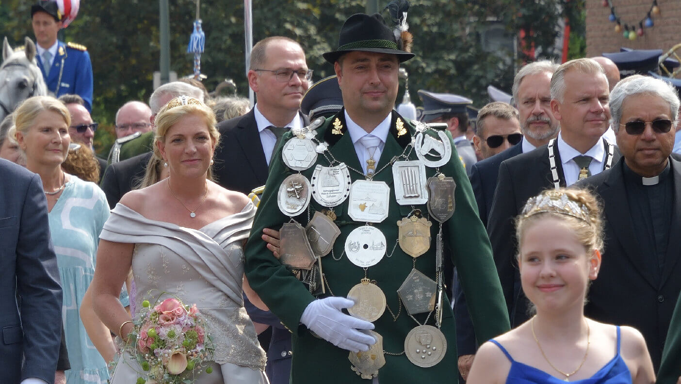 Gemeinsam mit dem amtierenden Schützenkönig nehmen der gegenwärtige Jungschützenkönig und der Pagenkönig am Sonntag beim großen Festzug auf der Fleher Straße die Parade ab, wohnen also dem Vorbeimarsch der Kompanien in vollem Ornat bei.