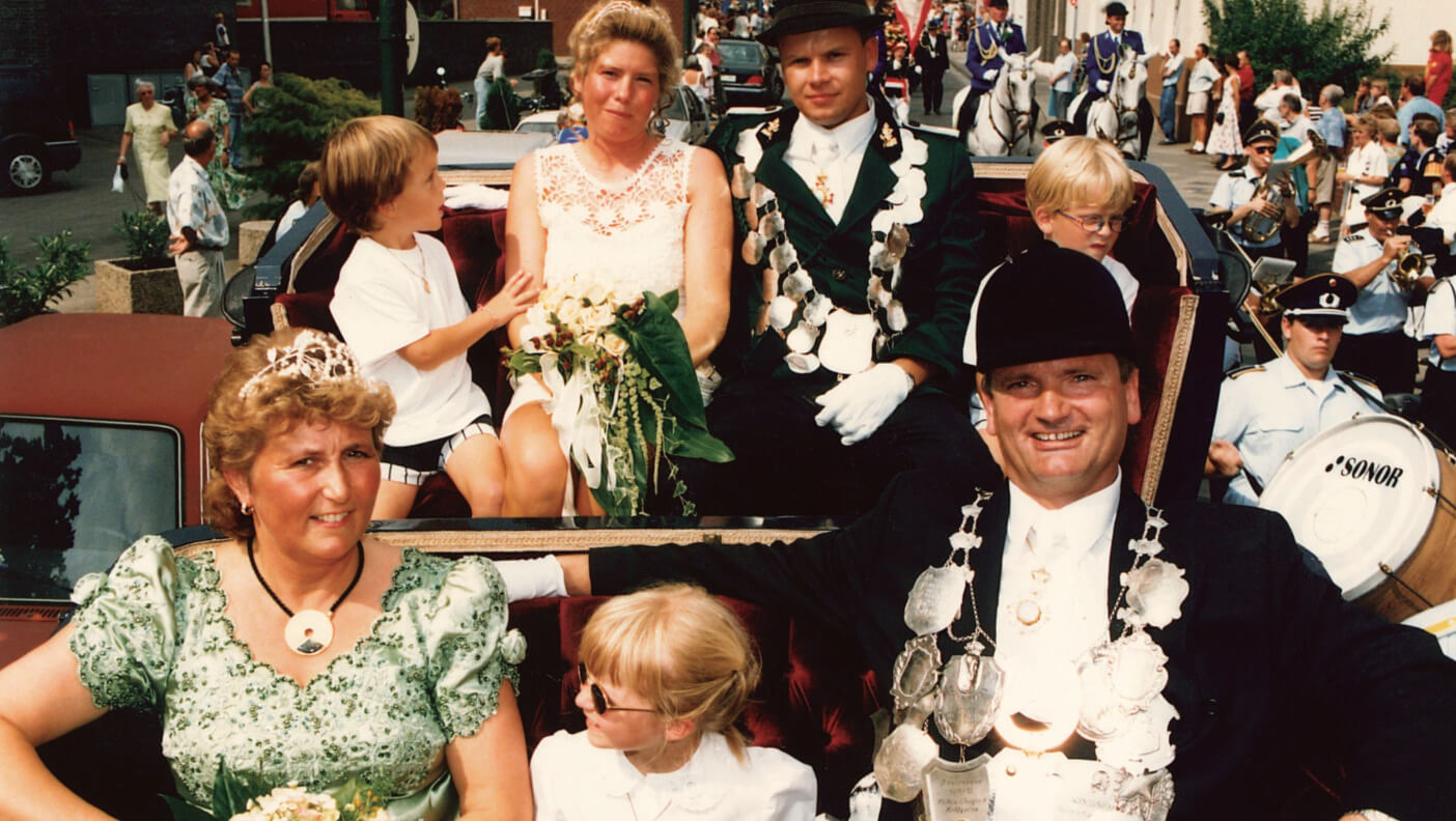 Die 1990er sind bestimmt von der Neuordnung der Welt nach dem Ende des Kalten Kriegs. Die Wiedervereinigung Deutschlands beendet den vier Jahrzehnte währenden Zustand der deutschen Teilung. Das Klon-Schaf Dolly gewinnt ebenso an Popularität wie das World Wide Web. In Deutschland werden nur noch Autos mit eingebautem 3-Wege-Katalysator zugelassen, die Postleitzahlen werden fünfstellig und aus der Deutschen Bundespost werden durch Privatisierung die Deutsche Post AG und die Deutsche Telekom. Nach 16 Jahren endet die Ära von Helmut Kohl als Bundeskanzler und es ist zunehmend populär, per SMS zu kommunizieren und Spielfilme auf DVD zu konsumieren. Die deutsche Fußballnationalmannschaft mit Trainer Franz Beckenbauer wird zum dritten Mal in ihrer Geschichte Weltmeister, Michael Schumacher gewinnt seine beiden ersten von sieben Fahrer-Weltmeisterschaften in der Formel 1 und unsere Schützenbrüder freuen sich Jahr für Jahr auf das große Schützen- und Volksfest in Düsseldorf-Flehe und einen neuen Schützenkönig, der Werte für die Öffentlichkeit, letztlich also Gemeinwohl schafft.
