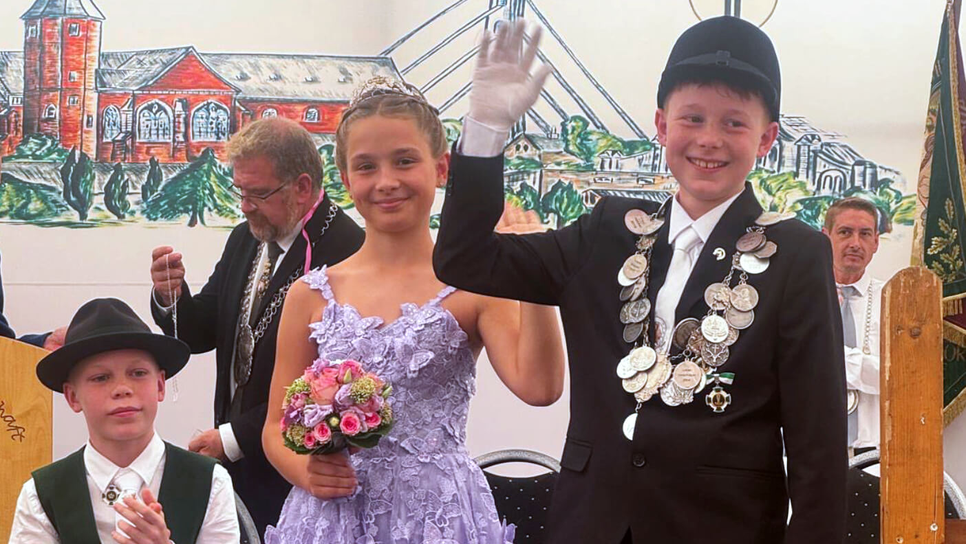 Gemeinsam mit dem amtierenden Schützenkönig nehmen der gegenwärtige Jungschützenkönig und der Pagenkönig am Sonntag beim großen Festzug auf der Fleher Straße die Parade ab, wohnen also dem Vorbeimarsch der Kompanien in vollem Ornat bei.