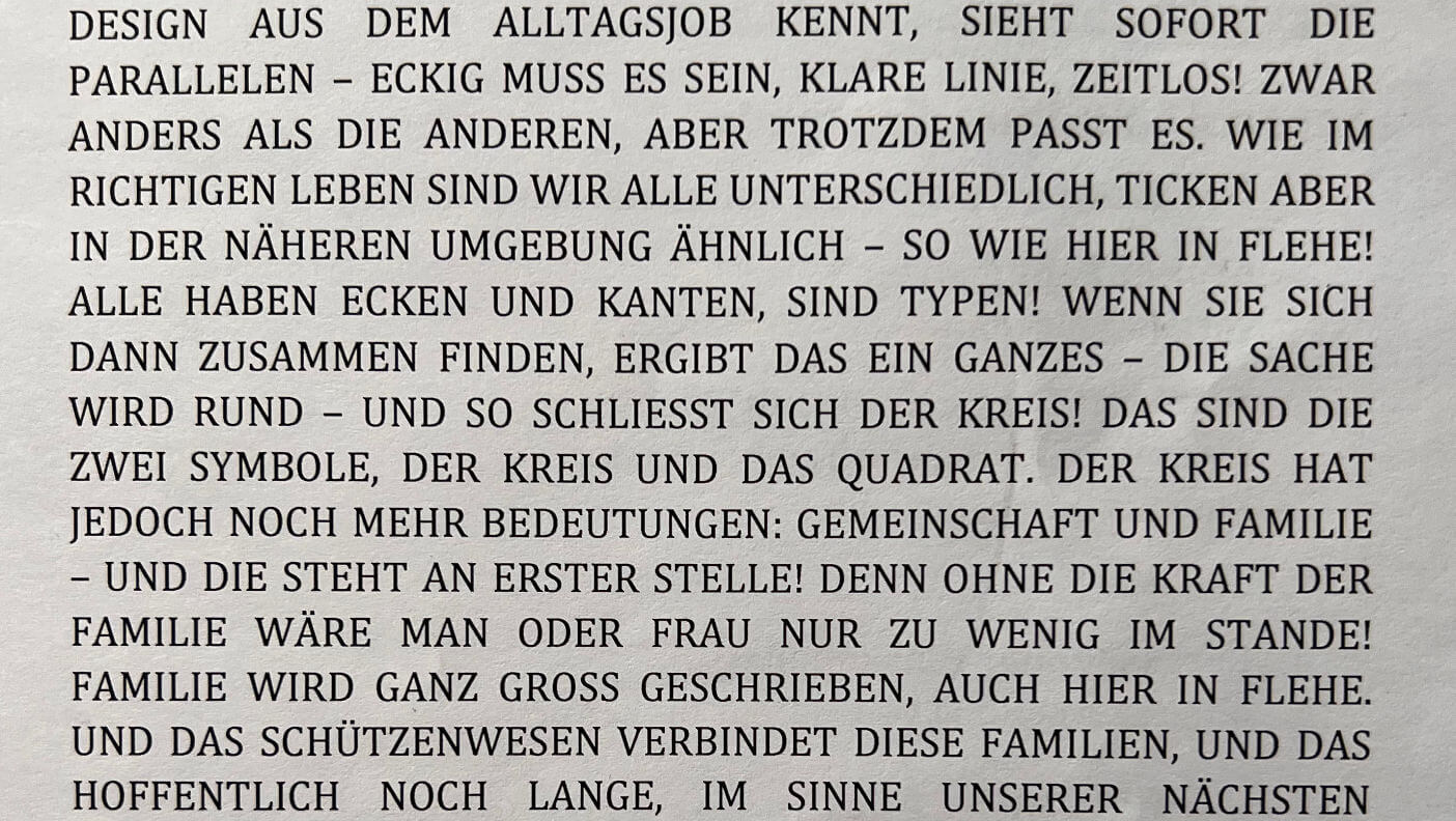Die Zahl 100 steht nicht nur für dieses Jubiläum, sondern auch für 100 Jahre Verbundenheit & Tradition, 100 Jahre Glaube, Sitte, Heimat und 100 Jahre Fleher Herzblut.